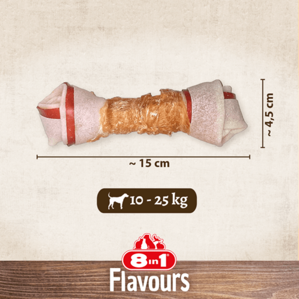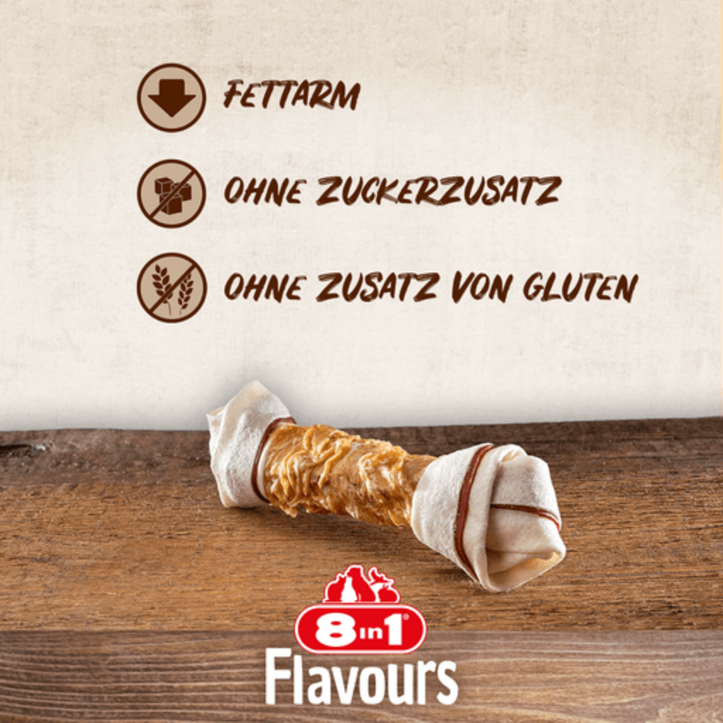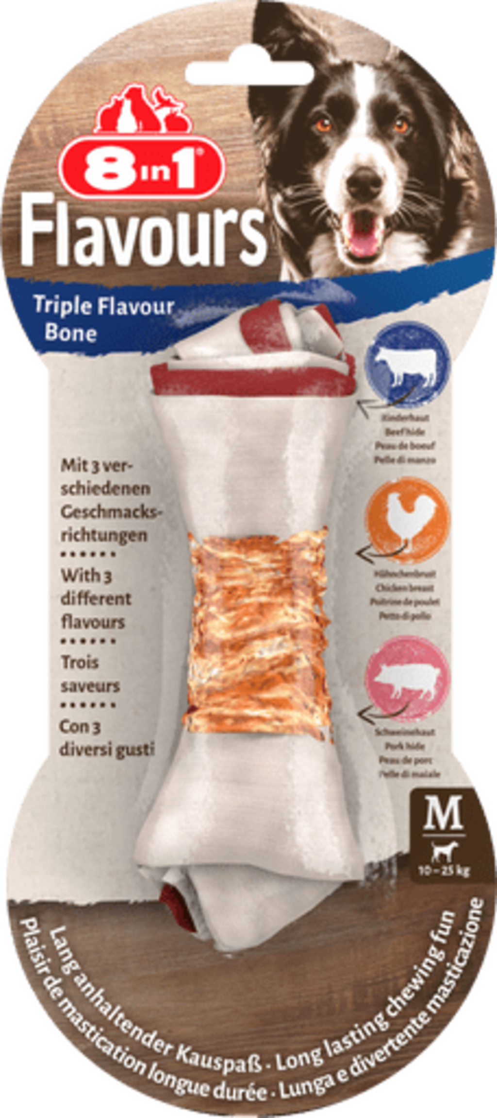 Die nährstoffreichen Triple Flavour Knochen von 8in1 sind ein köstlicher Leckerbissen für eine echte Geschmacksexplosion! Sie vereinen drei ausgesprochen schmackhafte Geschmacksrichtungen aus Schweine- und Rinderhaut, dabei sind sie von zart-saftiger Hähnchenbrust ummantelt.