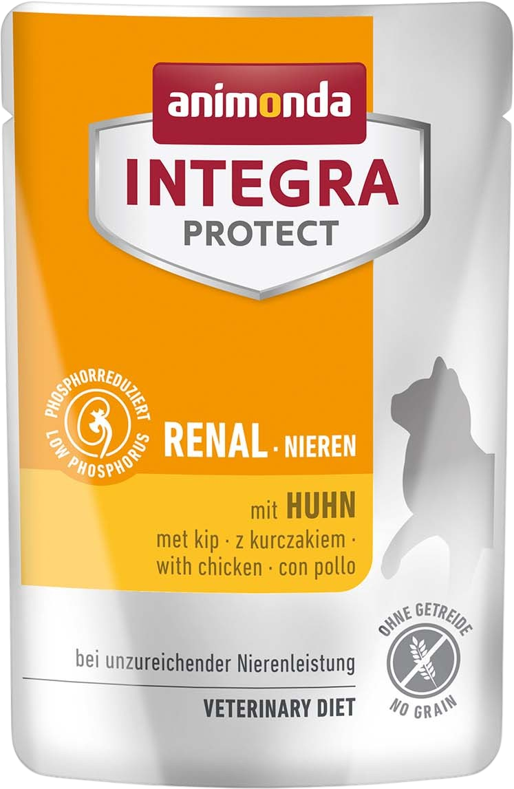 Das Nassfutter Integra Protect Renal unterstützt die Nierenfunktion der Stubentiger, die unter chronischer Niereninsuffizienz leiden. Im Vergleich zu herkömmlichem Futter enthält das Spezialfutter weniger Eiweiß und produziert so im Eiweißstoffwechsel weniger Harnstoff, was die Nieren nachhaltig schont. Darüber hinaus ist das Futter phosphorreduziert, um das Fortschreiten der Erkrankung zu verlangsamen.