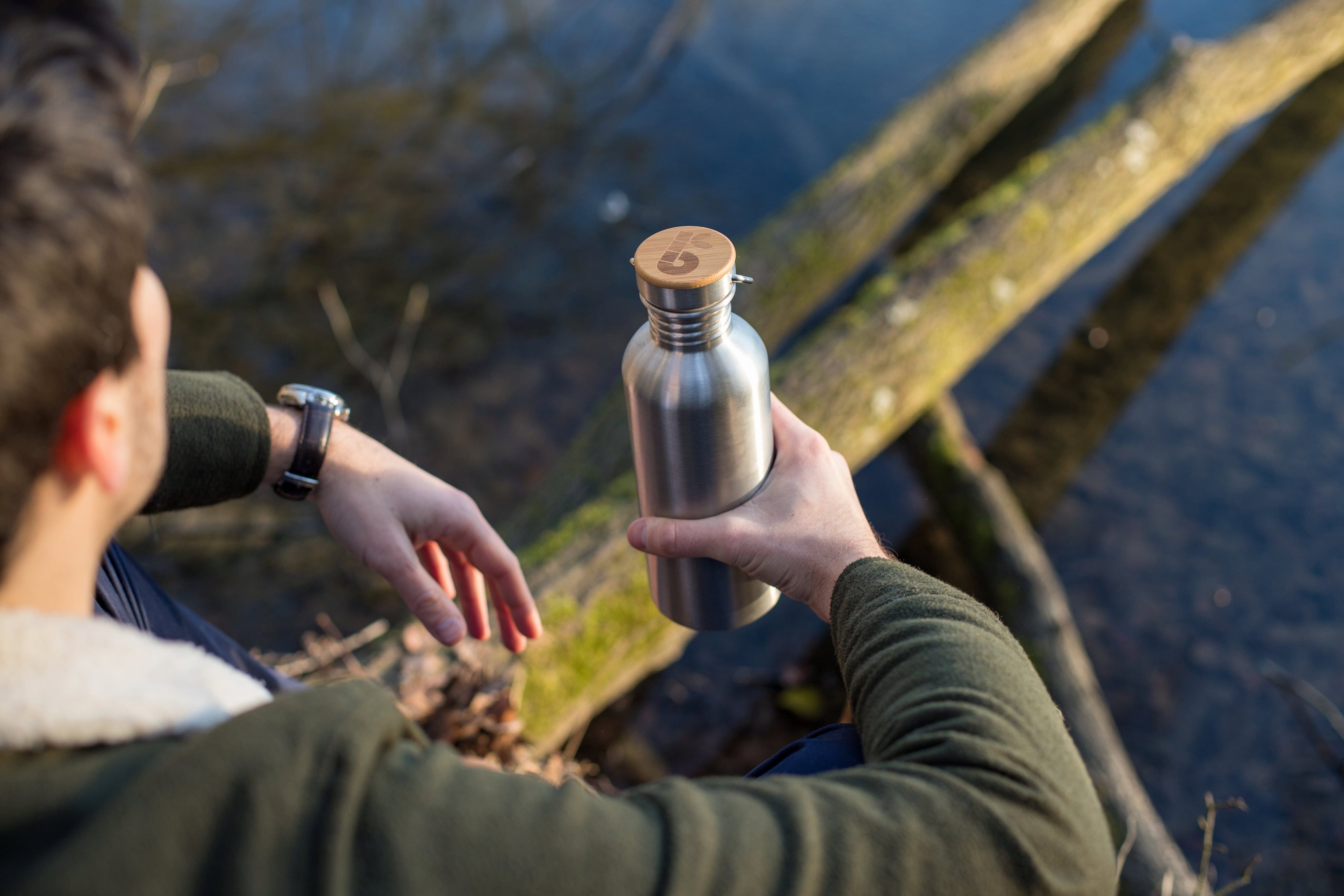 Mit dieser Flasche hältst du den perfekten Begleiter für deinen Alltag in der Hand! Egal ob für den Sport, im Büro, in der Schule oder zum Wandern. Sie wurde aus Edelstahl gefertigt, besitzt einen auslaufsicheren Schraubdeckel aus Bambus und glänzt durch ihr zeitloses sowie schlichtes Design. Die Flasche ist frei von schädlichen Chemikalien und kann nach der Verwendung ganz einfach mit einer Flaschenbürste gereinigt werden.