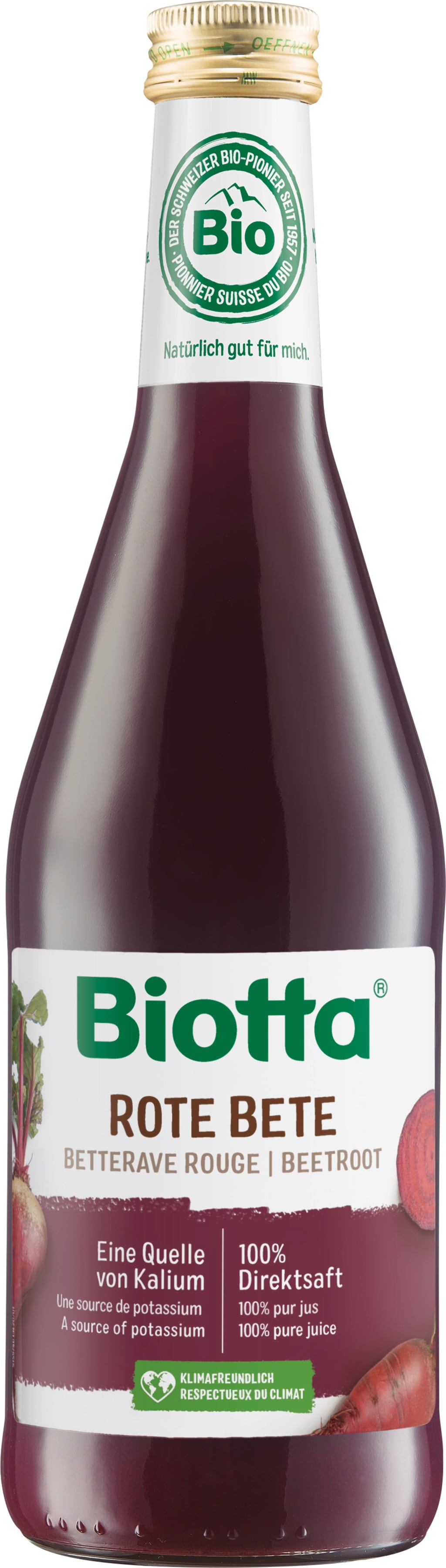 Biotta Roter Bete Saft ist 100 % erntefrisch gepresster Bio-Saft, direkt vom Feld in die Flasche. In den fruchtbaren Böden der Bodensee-Region wachsen und gedeihen zahlreiche Bio-Randen. Bio-Bauern aus der Region liefern die Knollen erntefrisch in die Biotta Manufaktur nach Tägerwilen. Dort wird das farbintensive Gemüse schonend zum naturbelassenen Biotta Rote Bete Saft weiterverarbeitet. Er ist sowohl bei Erwachsenen als auch bei Kindern beliebt.