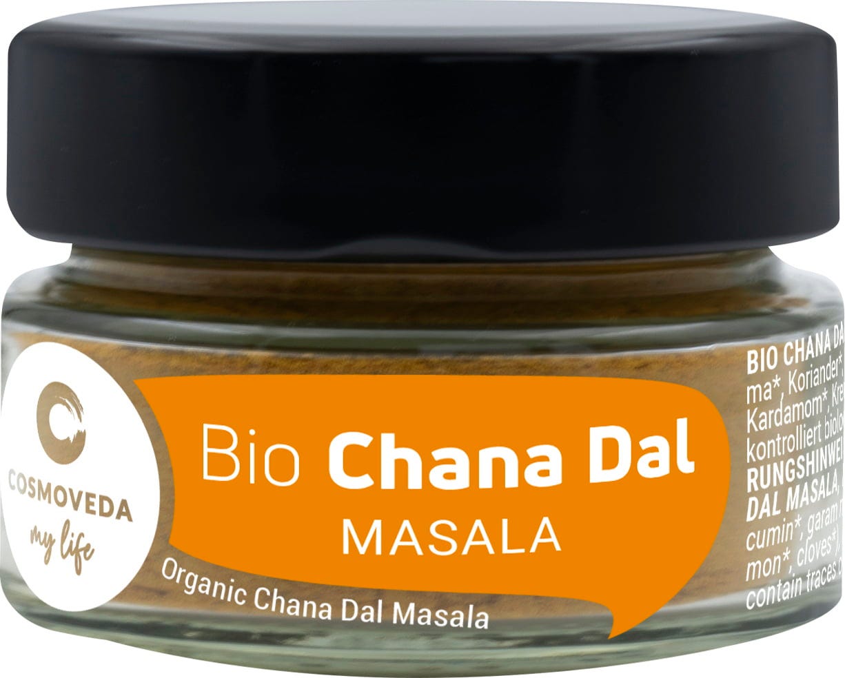 Das Bio Chana Dal Masala von Cosmoveda, eine speziell abgestimmte ayurvedische Mischung erlesener Gewürze, die Ihnen einfache, köstliche und leicht verdauliche Chana Dal Gerichte zaubern lässt.