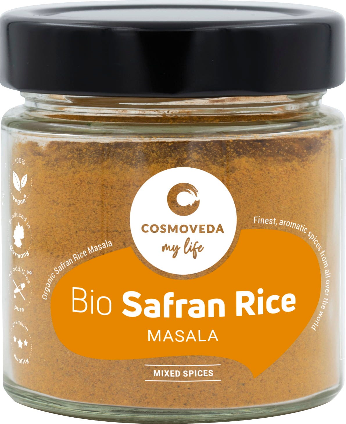 COSMOVEDA BIO Safran Rice Masala ist eine spezielle ayurvedische Mischung erlesener Gewürze, die Ihnen einen köstlichen Safran Reis zaubern lässt.