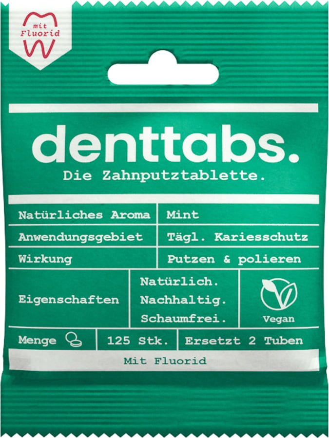 Die innovativen DENTTABS-Zahnputztabletten sind eine effektive Alternative zu herkömmlicher Zahnpasta. Auf Grund ihrer speziellen Zusammensetzung werden die Zähne poliert und bieten damit Belägen und Verfärbungen keine Angriffsfläche mehr. Das Resultat sind glattere, sauberere und gesündere Zähne. Überdies remineralisiert das in DENTTABS enthaltene Fluorid die Zähne effektiver und zielgerichteter, als fluoridierte Zahnpaste. Und das Beste daran: eine weiche Zahnbürste ist das ideale Mittel zum Zweck.