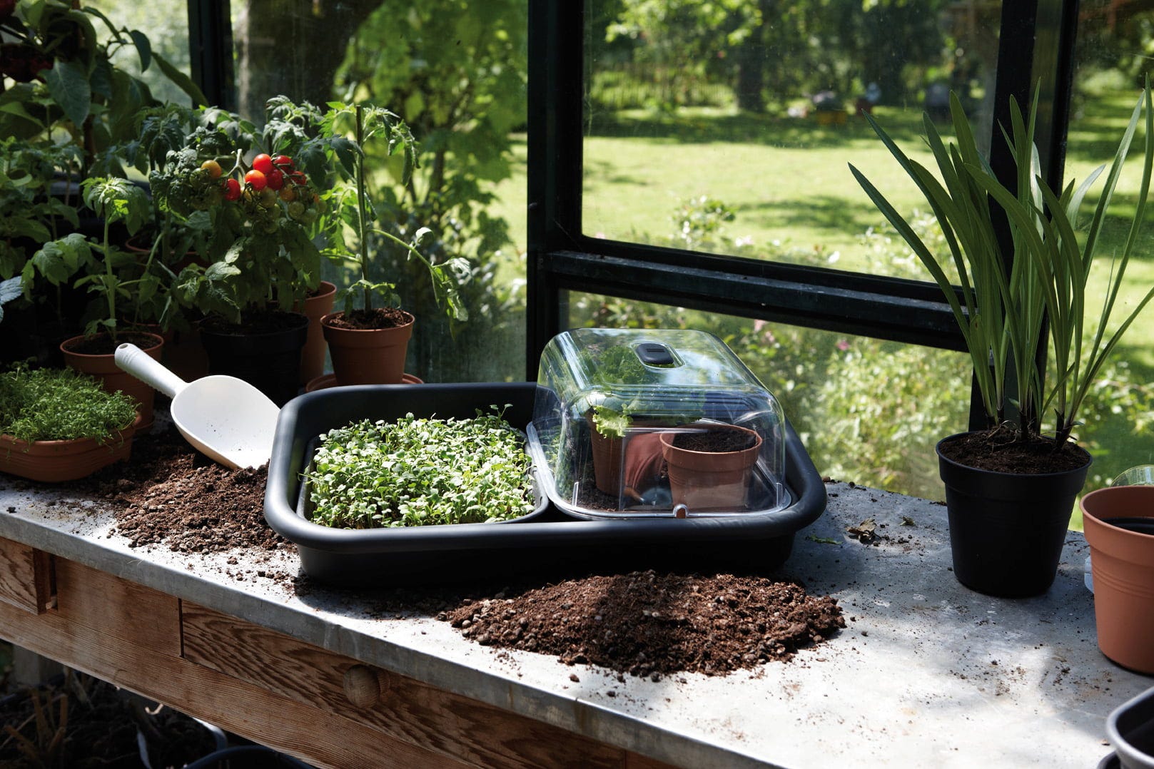 Dieses multifunktionale Tool ist nicht nur im Garten ein nützlicher Helfer, sondern auch in kleineren Gewächshäusern unverzichtbar. Sie können es als praktischen Arbeitstisch nutzen und kleines Gartenwerkzeug, Samen und Pflanzerde darauf ablegen. Der hohe Rand des Trays verhindert dabei zuverlässig, dass etwas herunter fällt.