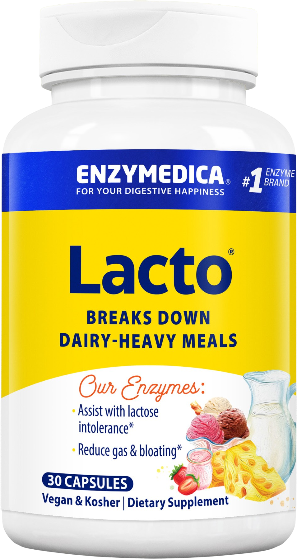 Lacto® enthält eine hochdosierte Mischung aus Enzymen, die gezielt auf die Aufspaltung von Milchprodukten abgestimmt sind. Die Kombination aus Lactase und Protease ermöglicht den gleichzeitigen Abbau von Milchzucker (Lactose) und Milcheiweiß (Casein). Durch die patentierte Thera-blend® Technologie bleiben diese Enzyme über das gesamte pH-Spektrum des Verdauungstraktes aktiv. Zusätzlich enthält die Formel weitere Enzyme, um die Verwertung einer kompletten Mahlzeit zu unterstützen. Die Kapseln sind rein pflanzlich, koscher und werden ohne den Einsatz von Gentechnik hergestellt.