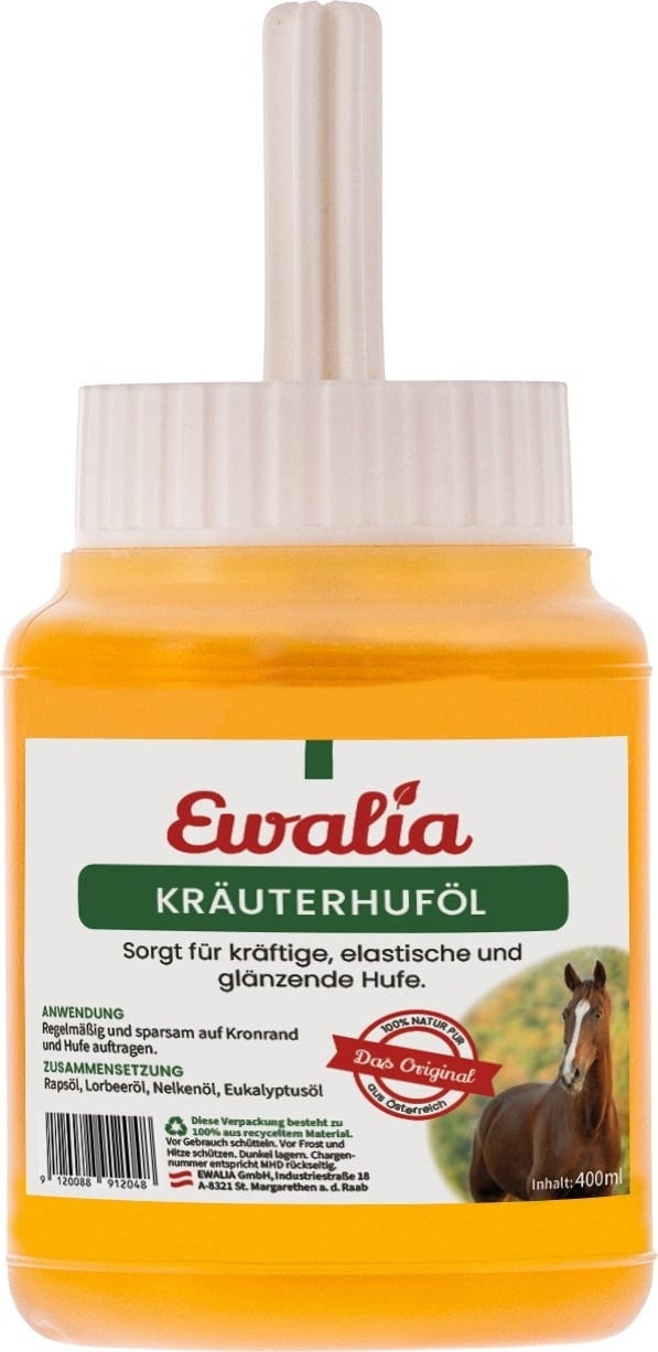 Das Kräuterhuföl von EWALIA sorgt für kräftige, elastische und glänzende Hufe. Es sollte regelmäßig und sparsam auf Kronrand und Hufe aufgetragen werden.