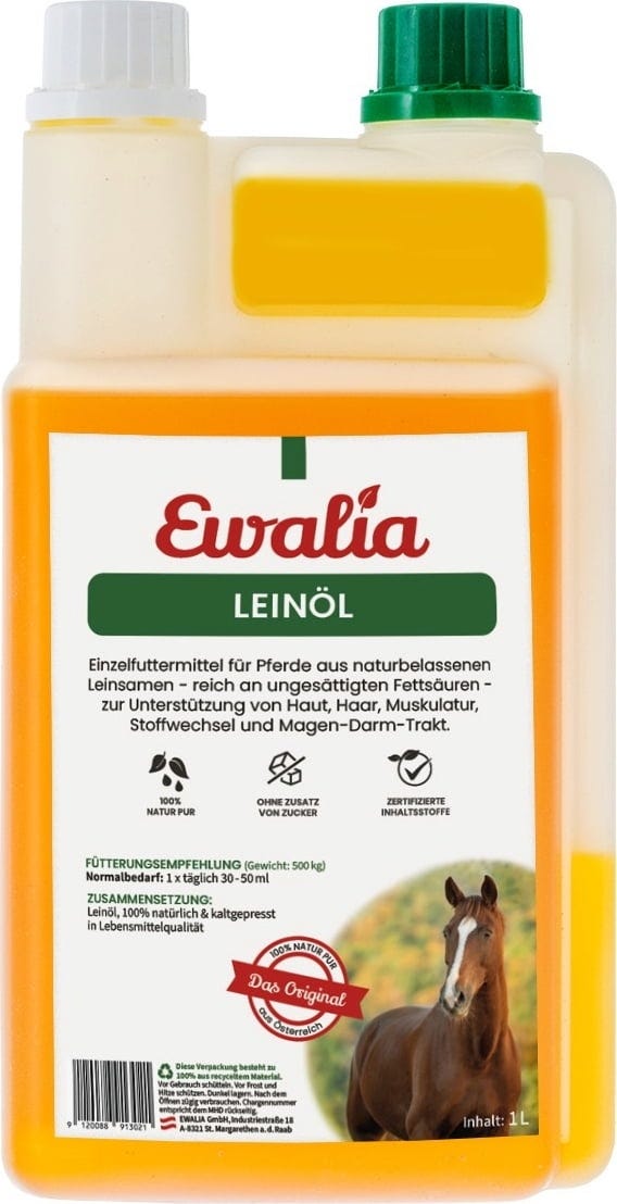 Leinöl dient als natürlicher Energielieferant. Dank des geringen Eiweißanteils und der positiven Wirkungsweise bei der Pferdefütterung empfehlen wir unser Leinöl als tägliche Futterbeigabe.