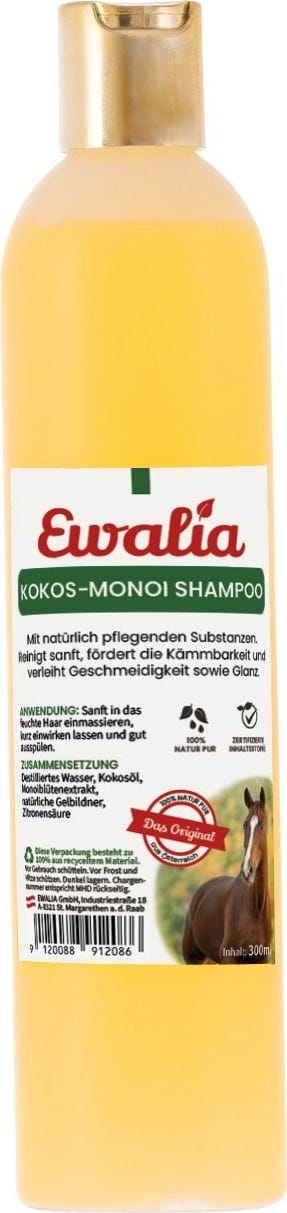 Das Shampoo von EWALIA reinigt sanft und fördert die Kämmbarkeit. Verleiht dem Pferdehaar Geschmeidigkeit und Glanz. Mit natürlichen Inhaltsstoffen aus Bio Kokosöl und Monoiblüten.