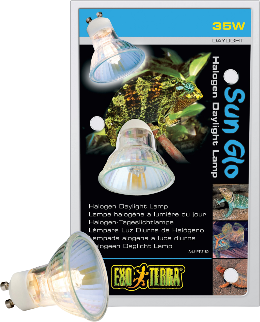 Exo Terra Sun Glo ist eine Breitspektrum-Halogenlampe, die natürliche Tageslichtverhältnisse in einem Terrarium schafft. Halogenlampen haben dank des Halogengases eine längere Lebensdauer, erzeugen höhere Temperaturen und ein natürliches, weißes Licht. Sie haben einen hohen Ausstoß an UVA- und Infrarot-Strahlen, sind dabei aber äußerst energieeffizient. Die Sun Glo Halogen liefert eine Farbtemperatur von 4750 K und zaubert dabei optimale Licht- und Wärmeverhältnisse her.