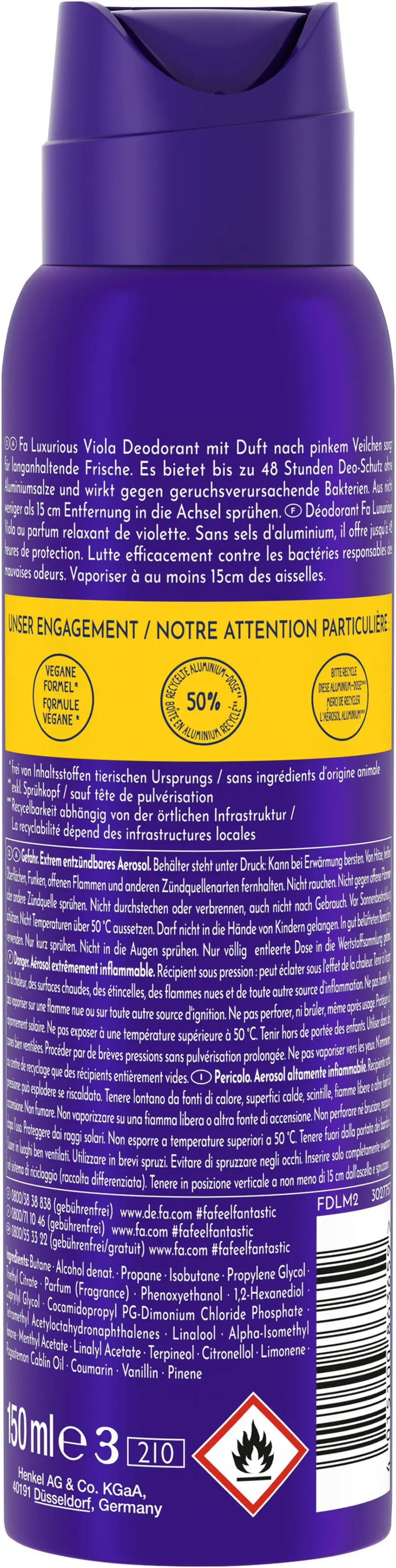 Der Fa Luxurious Moments Deospray verzaubert deinen Tag mit seinem angenehm-blumigen Duft nach pinker Viola. Der starke 48 Stunden Schutz verhindert unangenehmen Geruch, ohne dabei Flecken zu hinterlassen. Zusätzlich ist die Formel frei von Aluminiumsalzen, hautfreundlich und vegan.