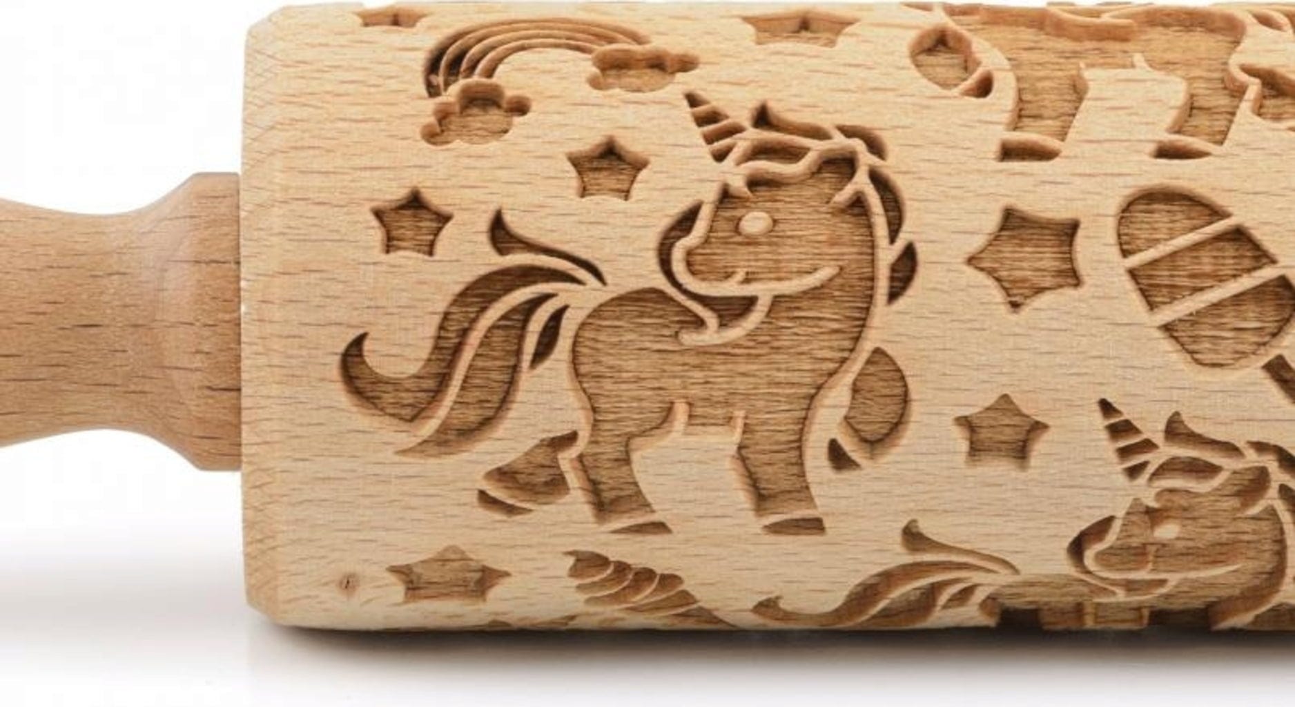 Einhornfans & Prinzessinnen aufgepasst! Mit dieser aufwendig gravierten Teigrolle aus hochwertigem Buchenholz zaubern kleine und große Bäckerinnen im Handumdrehen entzückende Einhorn-Kekse. So einfach war das Backen von dekorativ verzierten Plätzchen nämlich noch nie: Über den ausgerollten Teig rollen und anschließend nach Herzenslust mit Teigrädchen und Ausstechern in Form bringen, backen, fertig!