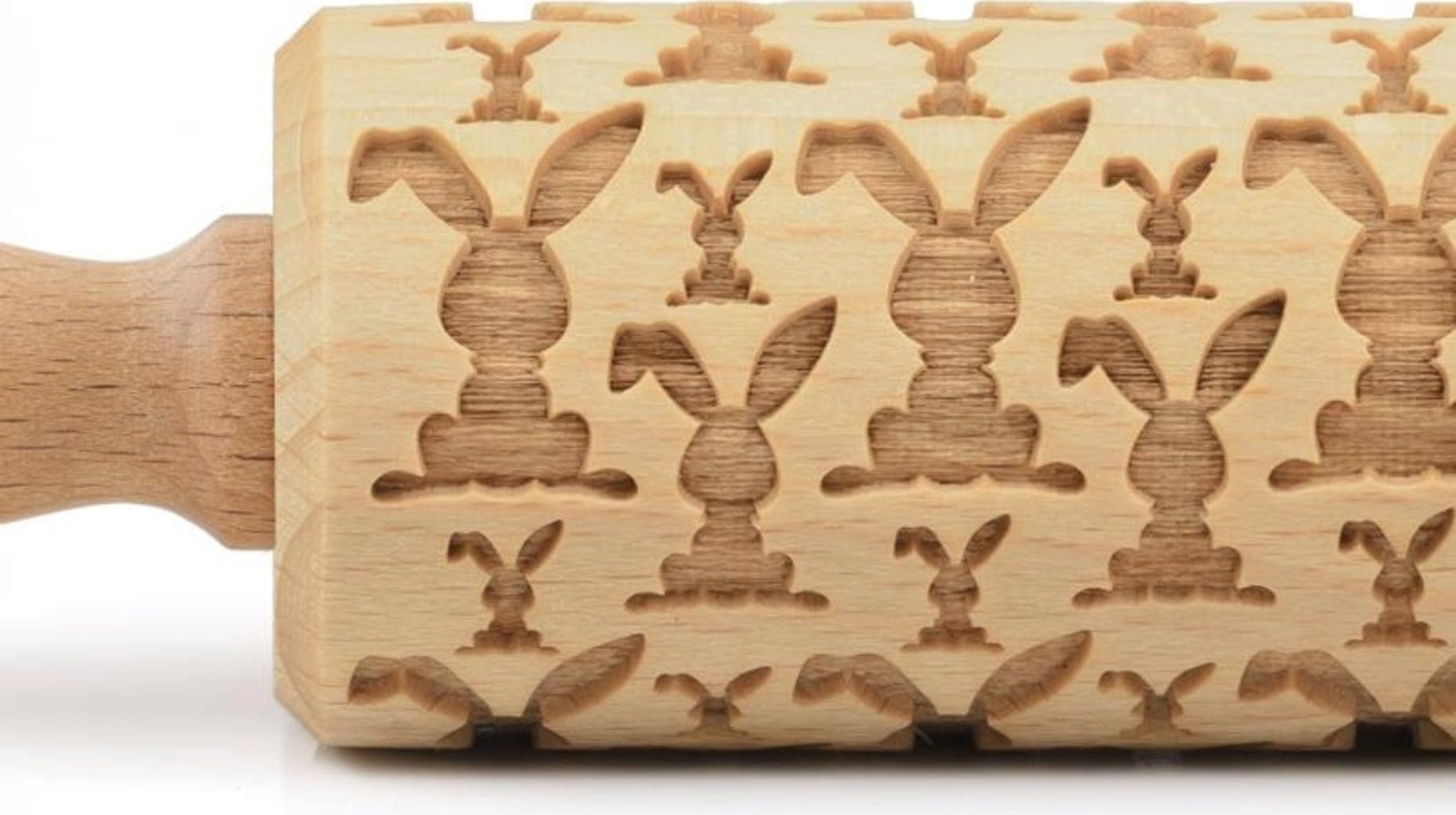 Kleine und große Osterhäschen zieren diese aufwendig gravierte Motivteigrolle aus hochwertigem Buchenholz. Perfekt für kleine Köstlichkeiten zu Ostern, denn so einfach war das Backen von dekorativ verzierten Plätzchen noch nie: Über den ausgerollten Teig rollen und anschließend nach Herzenslust mit Teigrädchen und Ausstechern in Form bringen, backen, fertig!