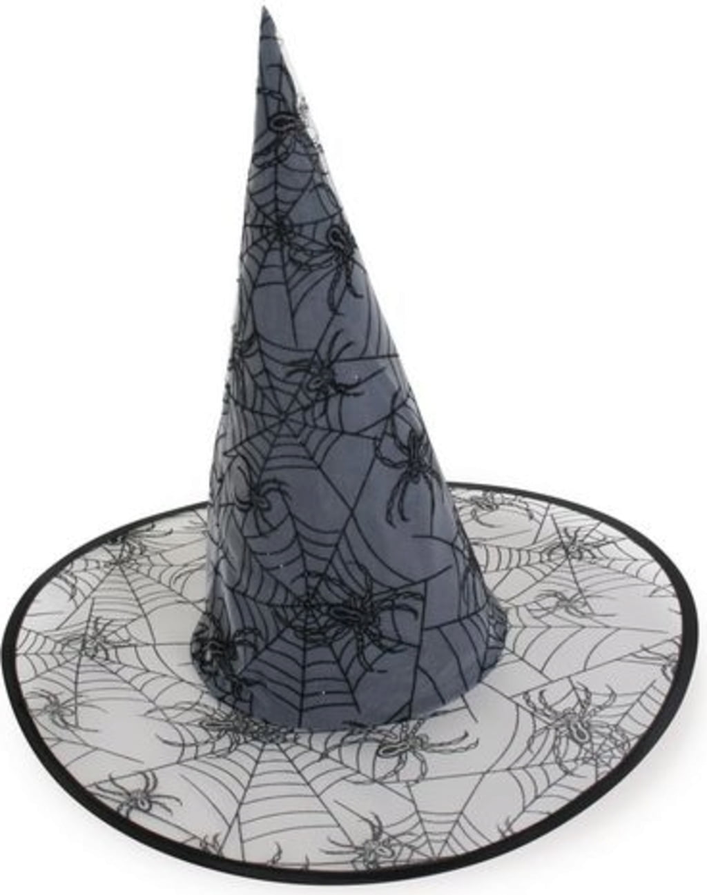 Dieser spitze Hexenhut wird von einem Spinnennetz überzogen. Darin haben es sich gefährlich aussehende Riesenspinnen gemütlich gemacht.