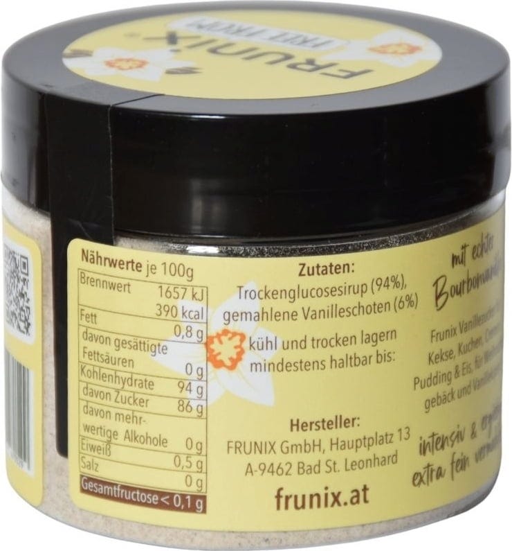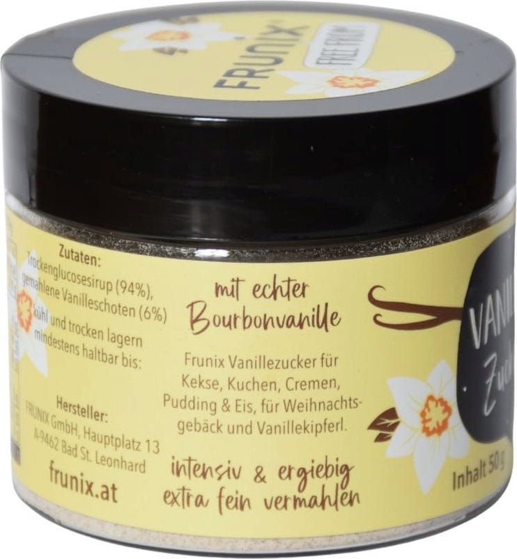 Vanillekipferl, Obstsalat-Dressings, Puddings, Kakao - FRUNIX® Vanillezucker mit 6 % echter Bourbon-Vanille verleiht Backwaren, Speisen und Getränken einen himmlischen Vanillegeschmack! Dank des intensiven Aromas ist das Produkt besonders ergiebig: Ein Teelöffel entspricht einem ganzen Päckchen herkömmlichen Vanillezuckers - anfangs mit Gefühl dosieren!