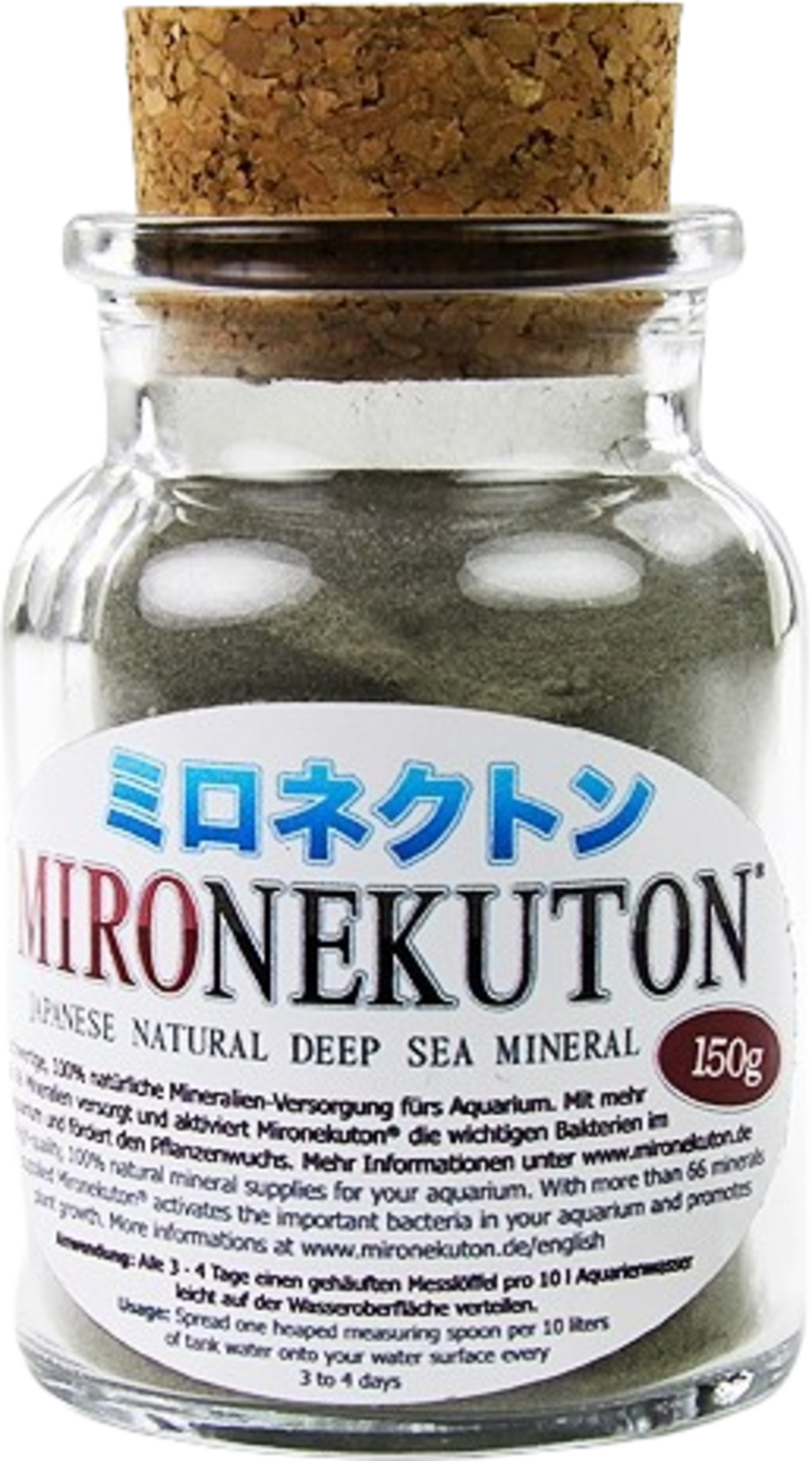 Das Mineralpulver Mironekuton aus Japan besteht zu 100% aus natürlichen Mineralstoffen und enthält weiters keinerlei Zusätze. Es ist bei japanischen Garnelenzüchtern und auch bei Pflanzenaquarianern sehr beliebt. Wenn du Soil-Bodengrund verwendest, ist Mironekuton besonders nützlich, weil es die wichtige Mikrobiologie erheblich verbessert. Die Schadstoffe abbauenden Bakterien arbeiten effizienter, wenn sie gut mit Mineralstoffen versorgt sind, die Wasserqualität wird besser, das System insgesamt läuft stabiler. Das Pulver sorgt außerdem für stabile Wasserwerte.