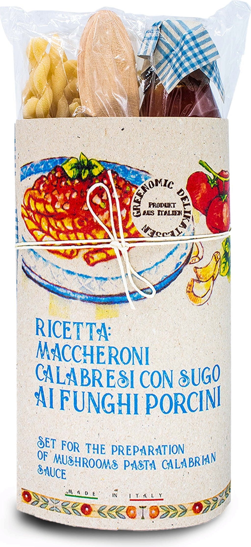 Geschenketipp: Das Set ist mit einer liebevoll illustrierten Papierbanderole verpackt und enthält neben Pasta und Sugo auch einen Buchenholz-Kochlöffel. Somit ist es ideal als kleines Geschenk oder Mitbringsel für Genießer.