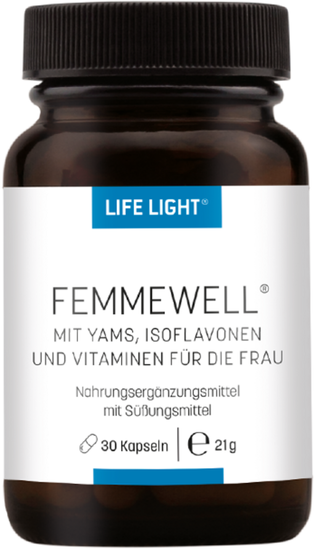 Life Light® FemmeWell Meno Formula enthält eine ausgewogene Kombination aus pflanzlichen Extrakten, Vitaminen, Mineralstoffen und Coenzymen. Enthalten sind Yamswurzel, Isoflavone, Leinsamenöl, Rosenwurz, Coenzym Q10, NADH, B-Vitamine, Vitamin D, Vitamin K und Magnesium.