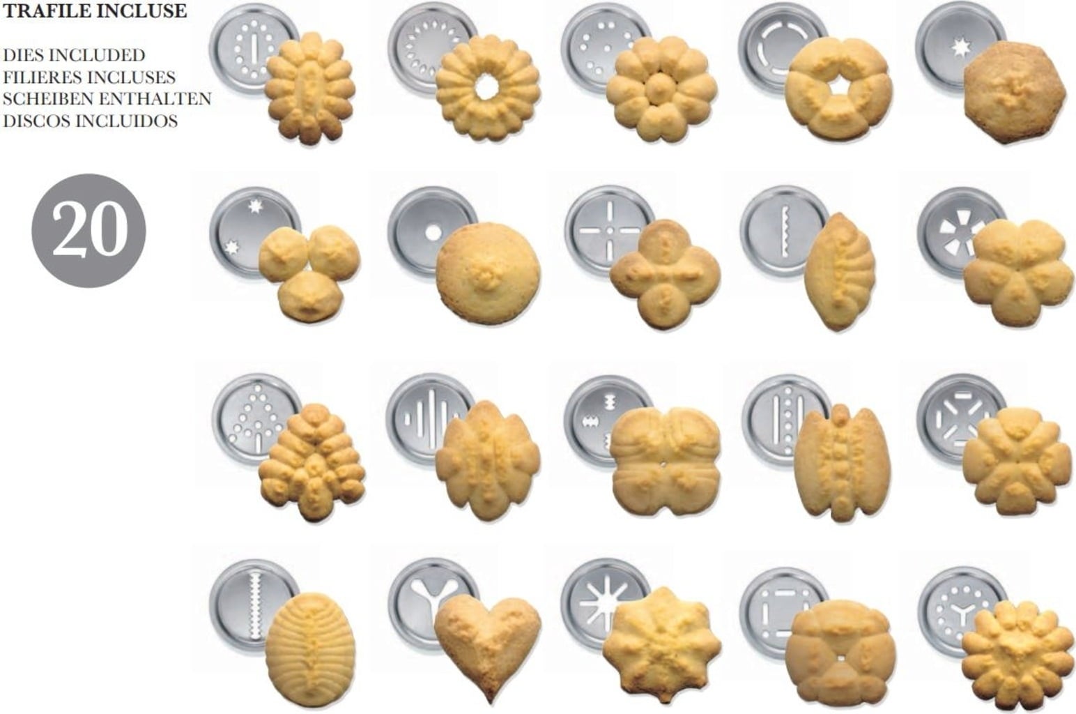 Mit der Plätzchenpresse können Kekse in 20 verschiedenen Formen hergestellt werden. Einfach den Teig in die Presse füllen und die gewünschte Form einlegen. Mit einer Füllung können ungefähr 20-25 große oder 35-40 kleine Plätzchen hergestellt werden. Ein weiterer Vorteil ist, dass man das Blech nicht einfetten oder mit Backpapier auslegen muss.
