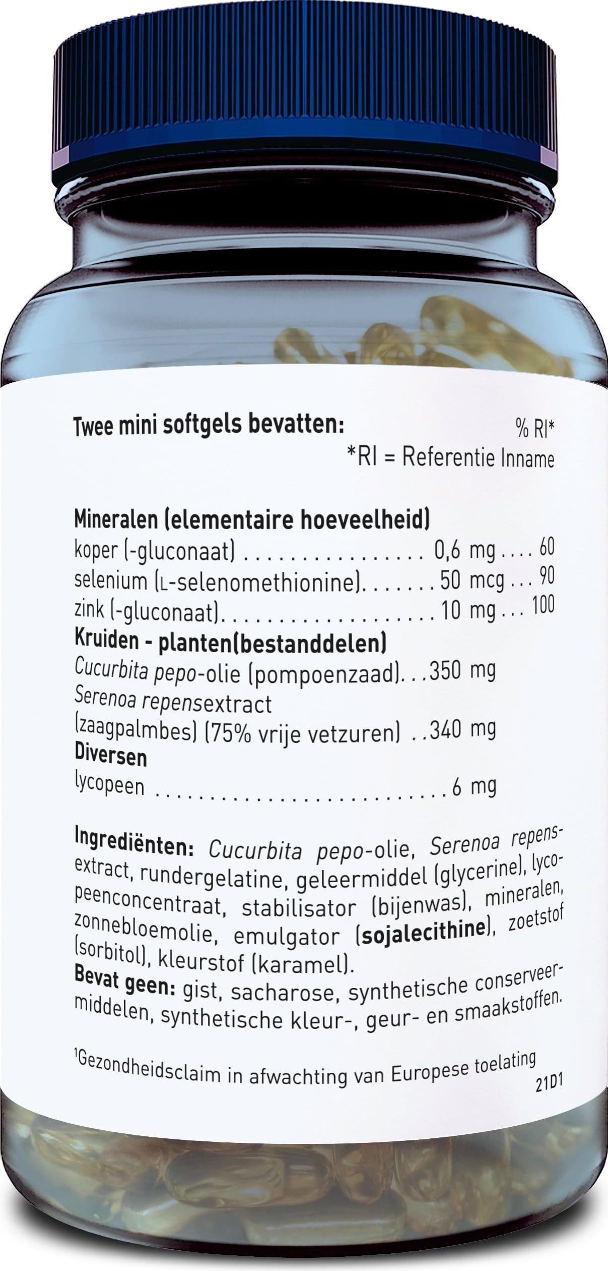 Kürbiskernöl, Sägepalmenextrakt, Kapselhülle (Rindergelatine), Zinkgluconat, Geliermittel (Glycerin), Lykopin Konzentrat, Kupfergluconat, Stabilisator (Bienenwachs, Sorbit), Sonnenblumenöl, Emulgator (Sojalecithin), Farbstoff (Zuckerkulör), Selenmethionin
