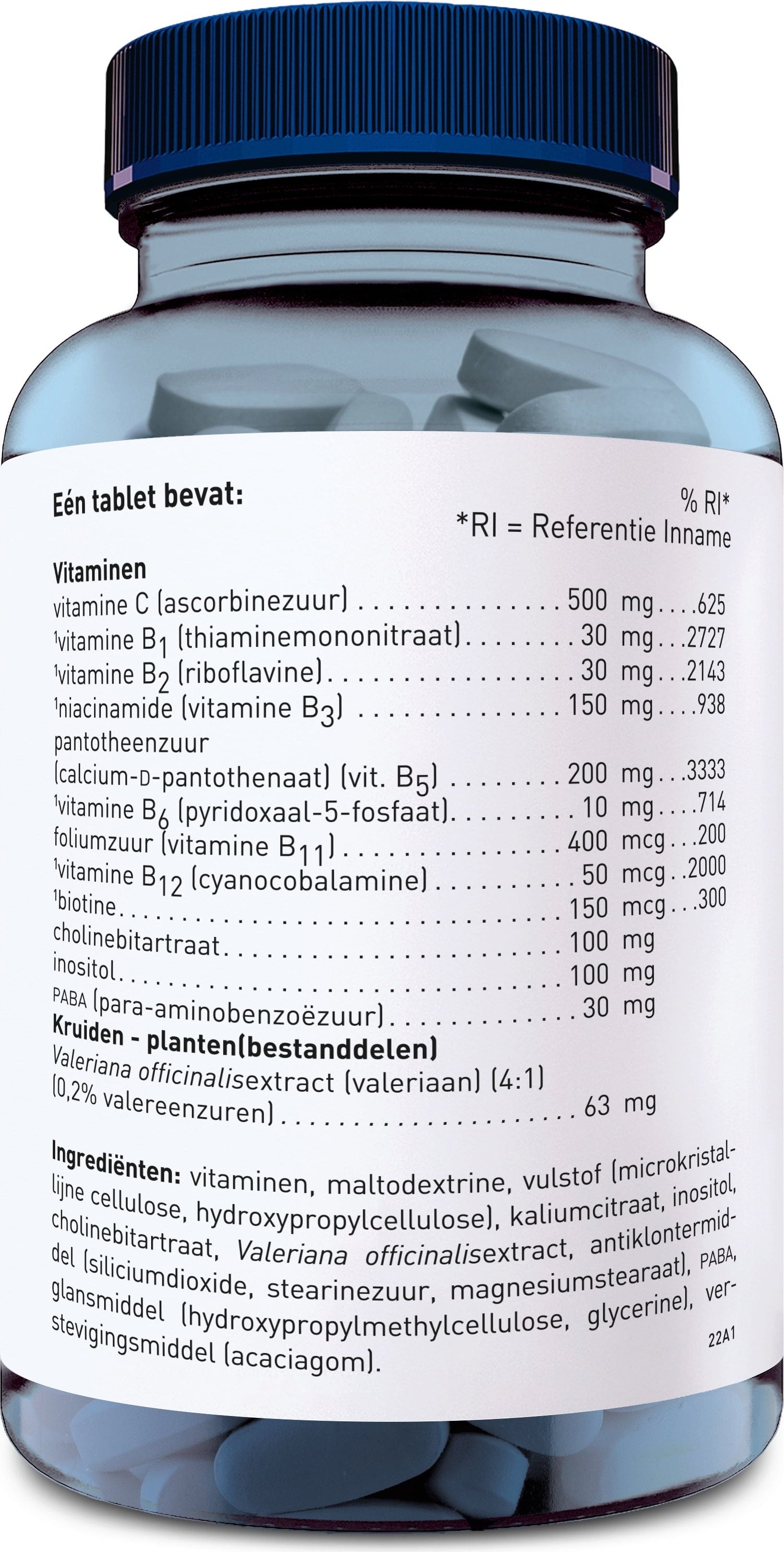 L-Ascorbinsäure, Maltodextrin, Vitamin B5 (Calciumpantothenat), Füllstoff (Mikrokristalline Cellulose, Hydroxypropylcellulose), Niacinamid, Kaliumcitrat, Inositol, Cholinbitartrat, Baldrianwurzelextrakt, Para-Aminobenzoesäure (PABA), Riboflavin, Thiaminmononitrat, Trennmittel (Siliciumdioxid, Speisefettsäuren, Magnesiumsalze von Speisefettsäuren), Überzugsmittel (Hydroxypropylmethylcellulose, Glycerin), Pyridoxinhydrochlorid, Festigungsmittel (Gummi Arabicum), Folsäure, Biotin, Cyanocobalamin