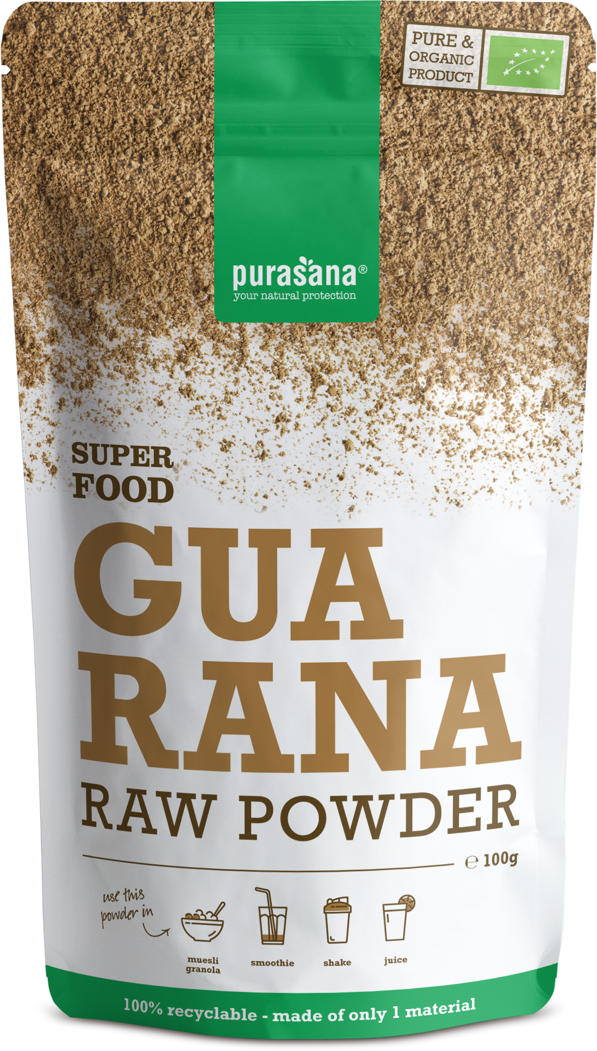 Guarana, Paullinia cupana, ist eine Kletterpflanze im Amazonas. Im Purasana Bio Guarana Pulver sind gemahlene Samen und Früchte. Guarana enthält Koffein auf natürliche Art und Weise, dass im Gegensatz zu Kaffee, langsamer vom Körper aufgenommen wird.