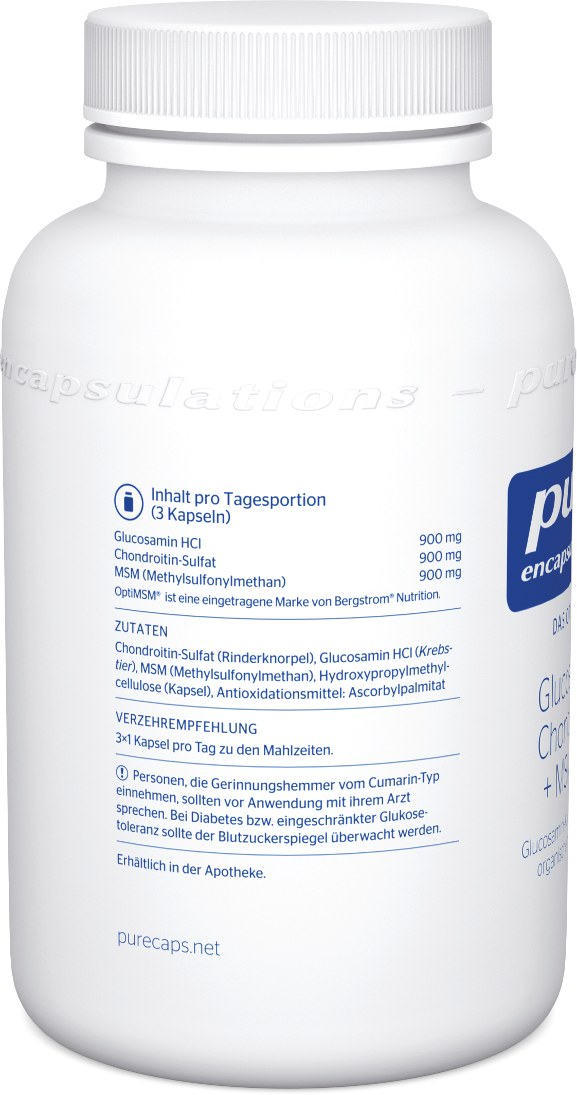 Das Nahrungsergänzungsmittel in Kapsel-Form beinhaltet Chondroitin Sulfat, Glucosamin HCl und Methylsulfonylmethan (MSM).