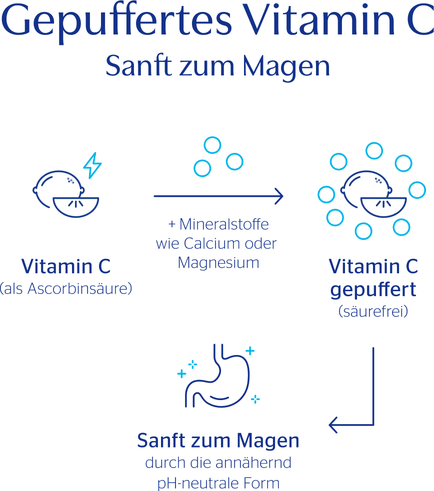 Vitamin C ist wasserlöslich und wohl einer der bekanntesten Mikronährstoffe. Gepuffertes Vitamin C weist einen annähernd neutralen pH-Wert auf. Zudem liefert das Produkt zusätzlich den Mineralstoff Calcium und die Spurenelemente Natrium und Kalium.