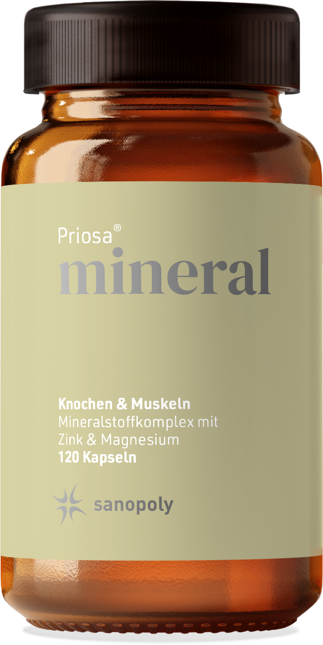 Priosa®MINERAL ist ein Komplex aus unterschiedlichen Mineralstoffen und Spurenelementen. Außerdem sind in den Kapseln zusätzlich der natürliche Schwefel Methylsulfonylmethan (MSM), die Aminosäuren L-Cystein und L-Methionin enthalten.