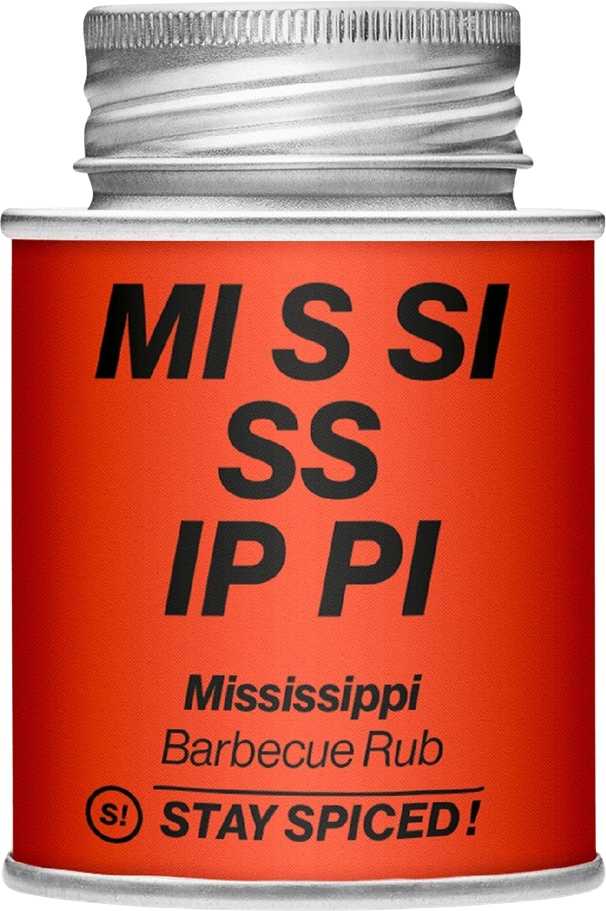 Mit dem Mississippi - Barbecue Rub verbeugt sich Stay Spiced! vor den großartigen Aromen der US-Südstaatenküche. Die Mischung enthält neben den oben genannten klassischen Reingewürzen z. B. noch Bengalischen Langpfeffer, Paprika und Demerara Roh-Rohrzucker.