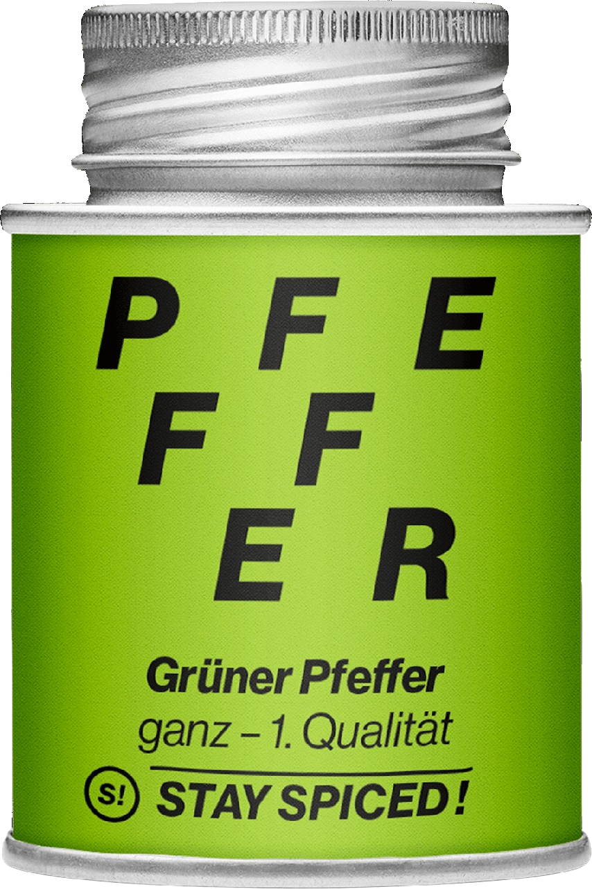 Wusstest du schon, dass grüne und schwarze Pfefferkörner von derselben Pflanze stammen? Die grünen Pfefferkörner werden allerdings unreif - also grün - geerntet und sofort weiterverarbeitet und getrocknet. Somit bleiben die intensive grüne Farbe und der milde und doch sehr aromatische Pfeffergeschmack erhalten.