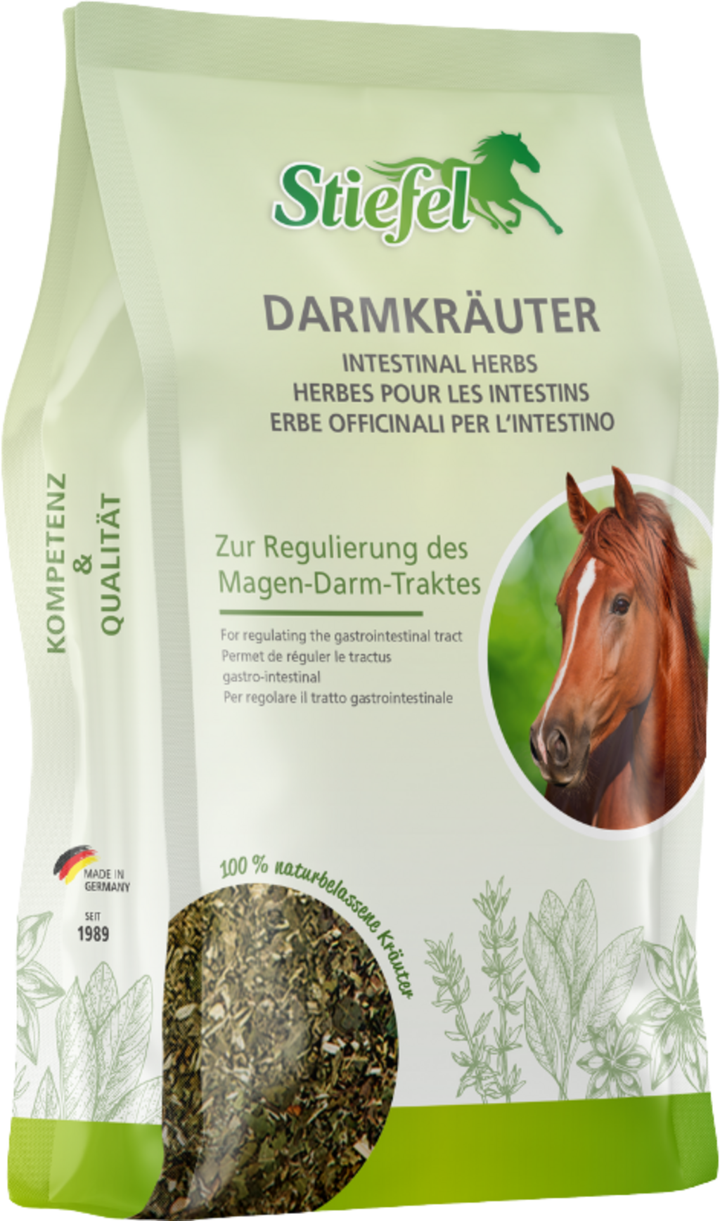 Stiefel Darmkräuter sind eine speziell ausgewählte, naturbelassene Kräutermischung zur Regulierung des gesamten Magen-Darmtraktes beim Pferd. Die Kräuter können sich positiv auf den Verdauungstrakt auswirken und so eine gesunde Verdauung fördern. Stiefel Darmkräuter können sowohl dauerhaft als auch gezielt in Phasen erhöhter Beanspruchung des Magen-Darm-Traktes verabreicht werden, z.B. bei Stallwechsel, Umstellung der Fütterung oder zu Beginn der Weidesaison.