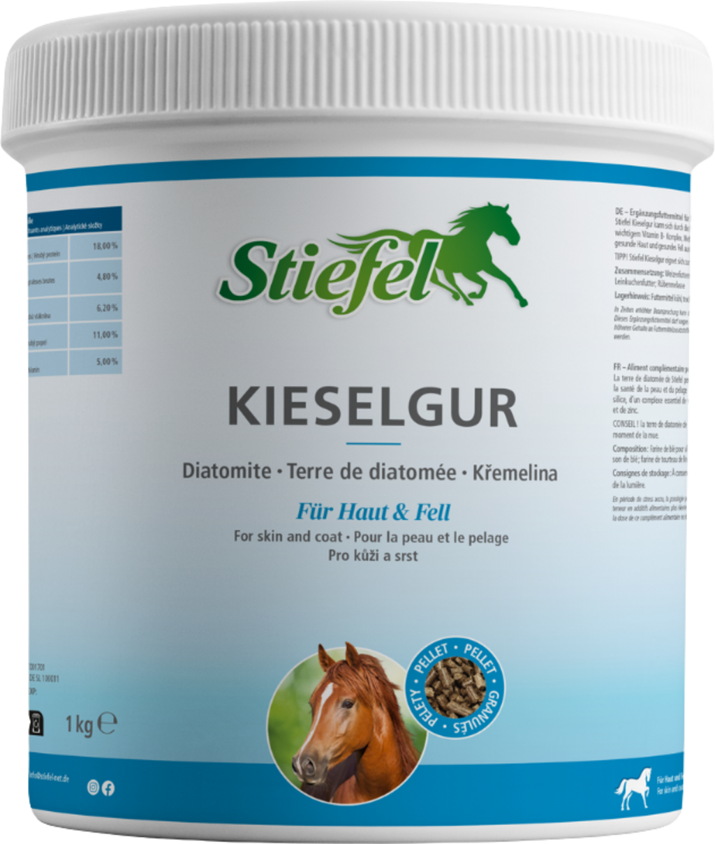 Stiefel Kieselgur kann sich durch die Kombination aus Kieselerde, wichtigem Vitamin B- Komplex, Methionin und Zink positiv auf gesunde Haut und gesundes Fell auswirken.