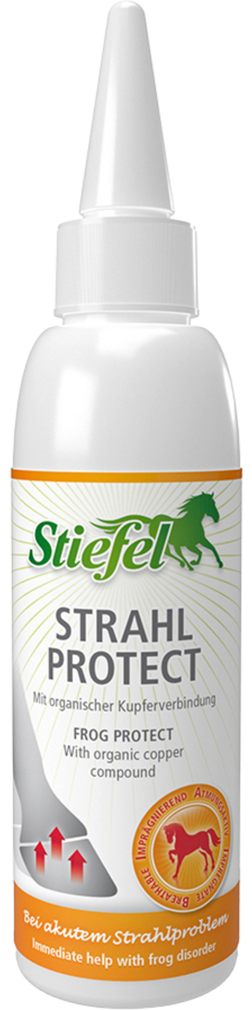 Stiefel Strahl Protect wird bei akuten Strahlproblemen eingesetzt und kann den Hufstrahl vor schädlichen Einflüssen, wie Ammoniak oder Urin in der Boxeneinstreu, schützen. Stiefel Strahl Protect enthält eine organische Kupferverbindung, eine hochaktive Trägersubstanz, die den Strahl pflegen und trocken halten kann. Strahl und Sohle werden imprägniert, die Atmungsaktivität des Horns bleibt jedoch erhalten. Durch das tiefe Eindringen des Produktes in die Strahlfurche wird eine besonders tiefgehende Wirkung erreicht.