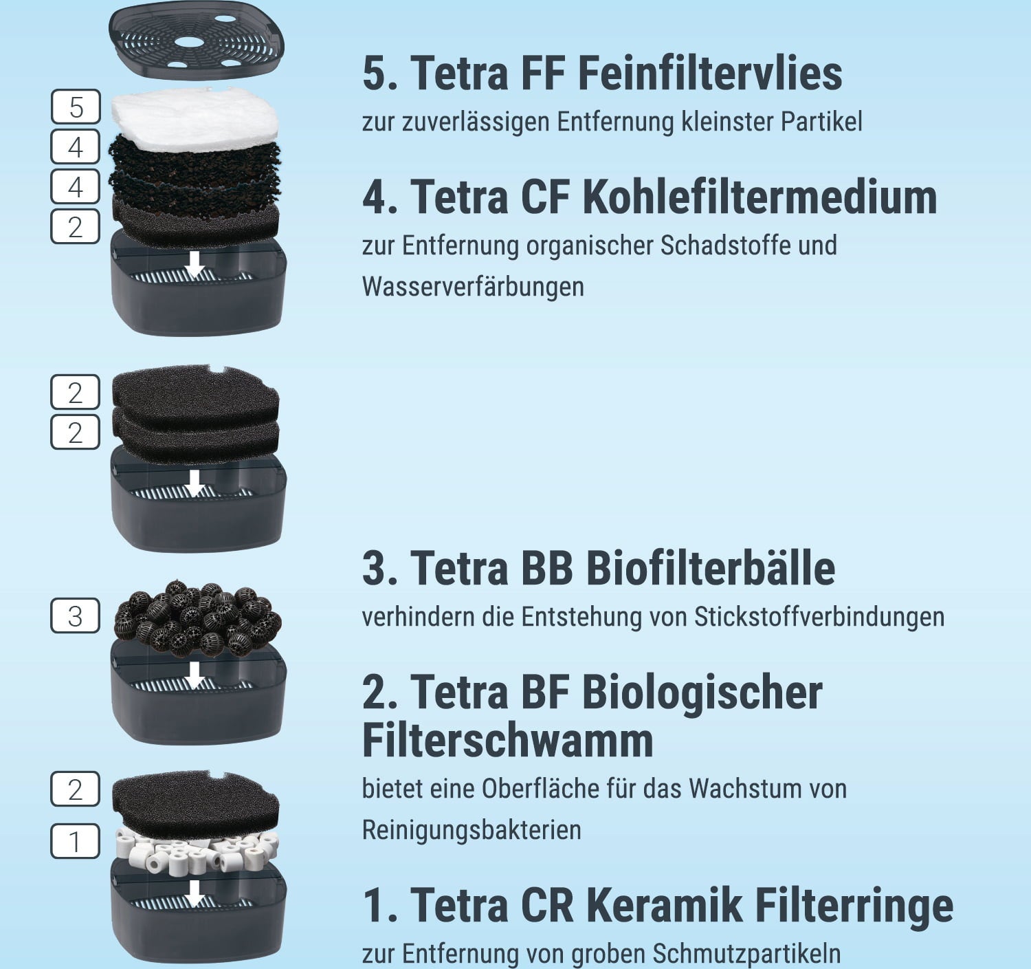 Für stabile Wasserwerte sorgt das spezielle Mehrkammer-Filtersystem, welches das Aquarienwasser bis zu 5 Mal biologisch, mechanisch und chemisch filtert. Hier bietet die Firma Tetra ein Vielzahl an verschiedenen Filtermedien an. Du kannst den Filter frei nach deinen bedürfnissen mit folgenden Medien bestücken: Keramik-Filterringe, Kohlefiltermedien, biologische Filterschwämme, Feinfiltervlies und spezielle Bio-Filterbälle.