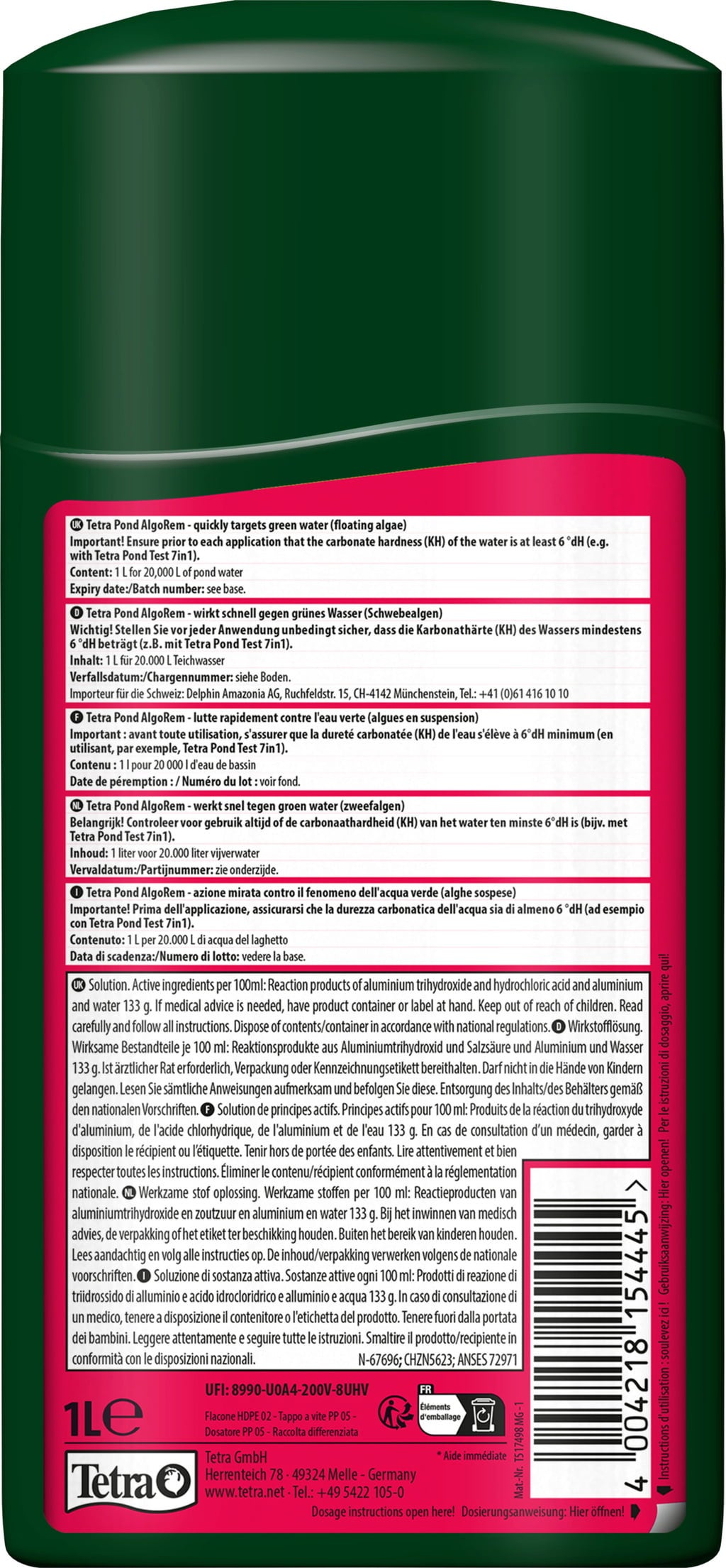 Tetra Pond AlgoRem beseitigt Schwebealgen innerhalb von 24 Stunden, indem es dem Wasser den Algennährstoff Phosphat entzieht. Bereits nach wenigen Stunden ist das Teichwasser wieder klar. AlgoRem beugt weiterem Algenwuchs vor. AlgoRem ist nicht für Störe geeignet. AlgoRem ist bei sachgemäßer Anwendung verträglich mit Wasserpflanzen, Tieren und Mikroorganismen. Die Wirkung tritt bereits innerhalb von 24 Stunden ein. Die Wirkung ist einfach: die Schwebealgen verklumpen und lassen sich so als Flocken manuell beseitigen oder vom Filter erfassen. Vor der Anwendung sollte die Karbonathärte mindestens 3° dKH beträgt, ggf. sollte diese erhöht werden.