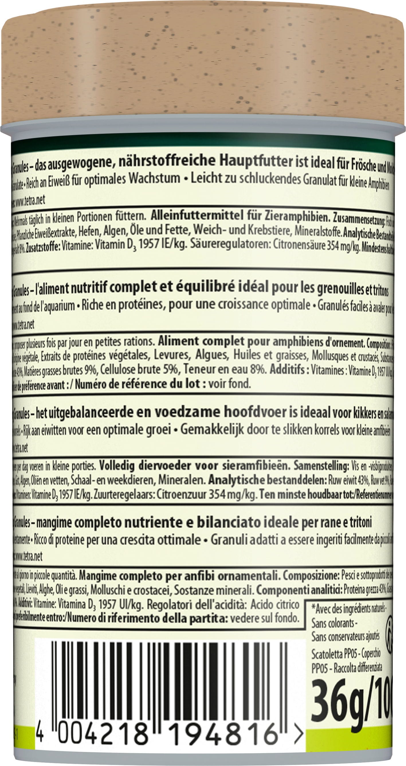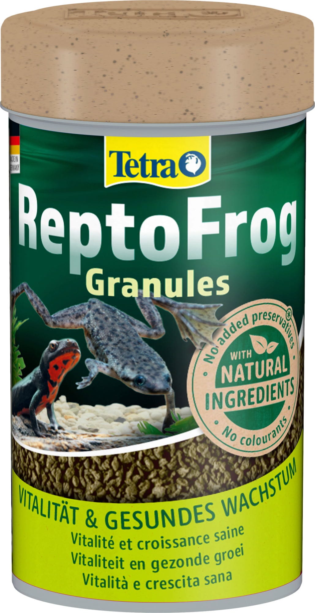 Tetra ReptoFrog Granules ist ein Hauptfutter für Wasserfrösche und Wassermolche. Das leicht zu schluckende Granulat ist eine gute Proteinquelle und reich an Eiweiß welches für optimales Wachstum sorgt. Aufgrund seiner geringen Größe ist es auch für kleine Amphibien bestens geeignet