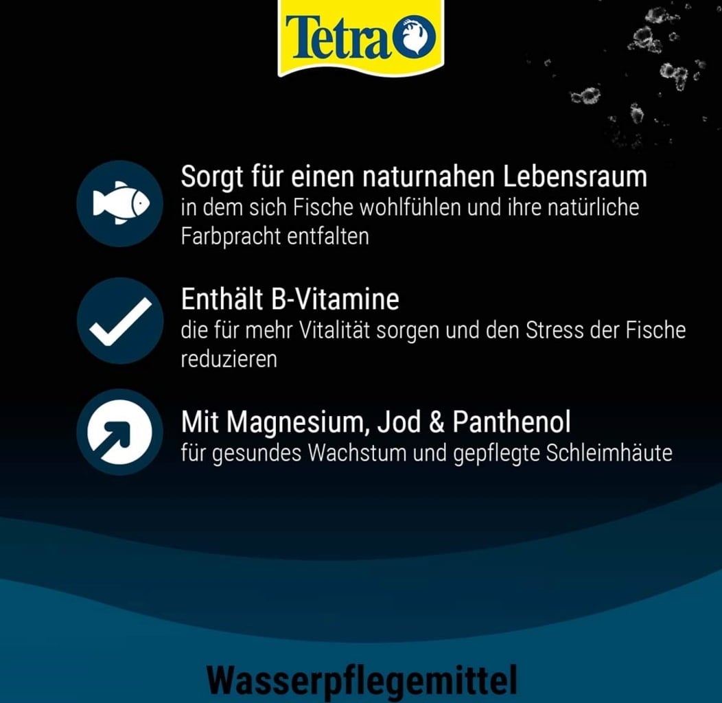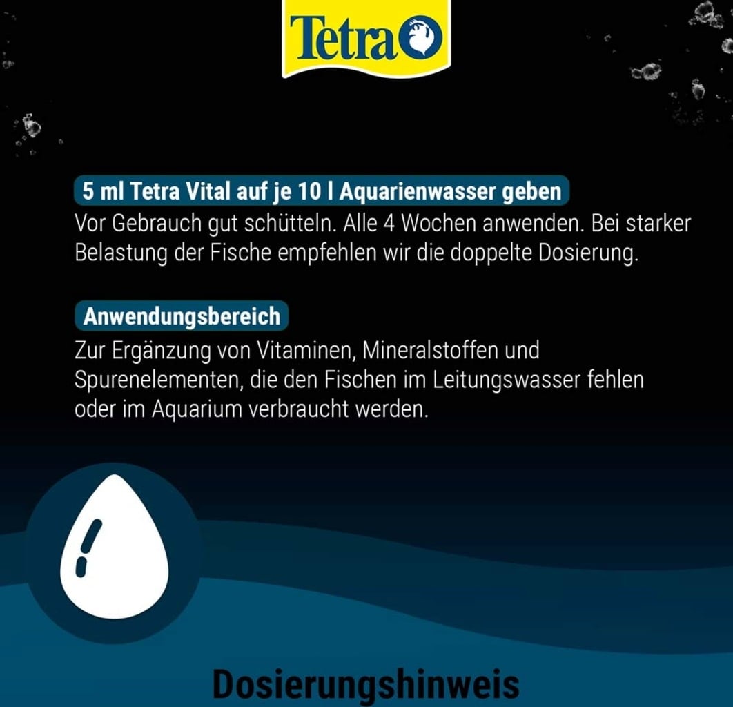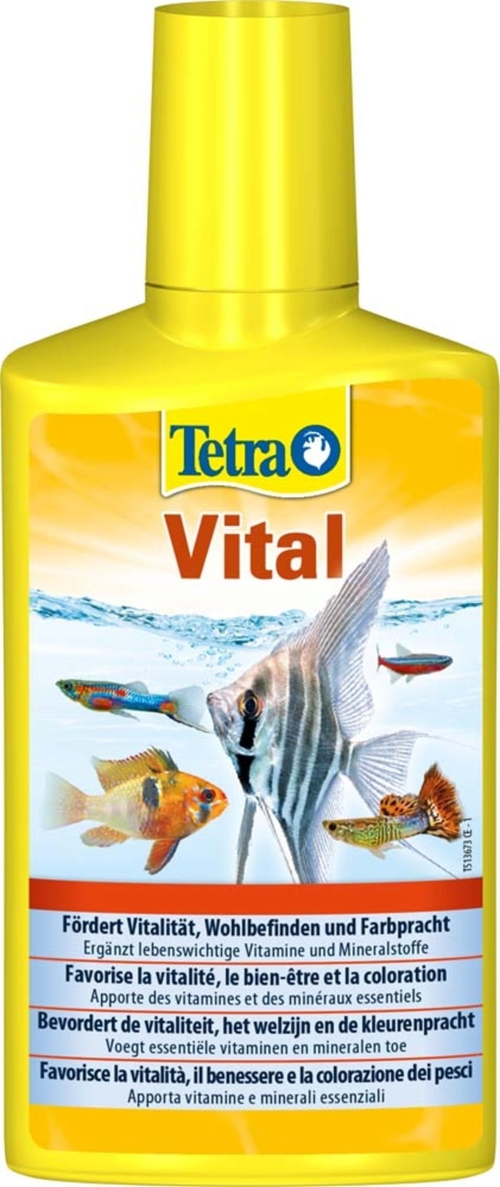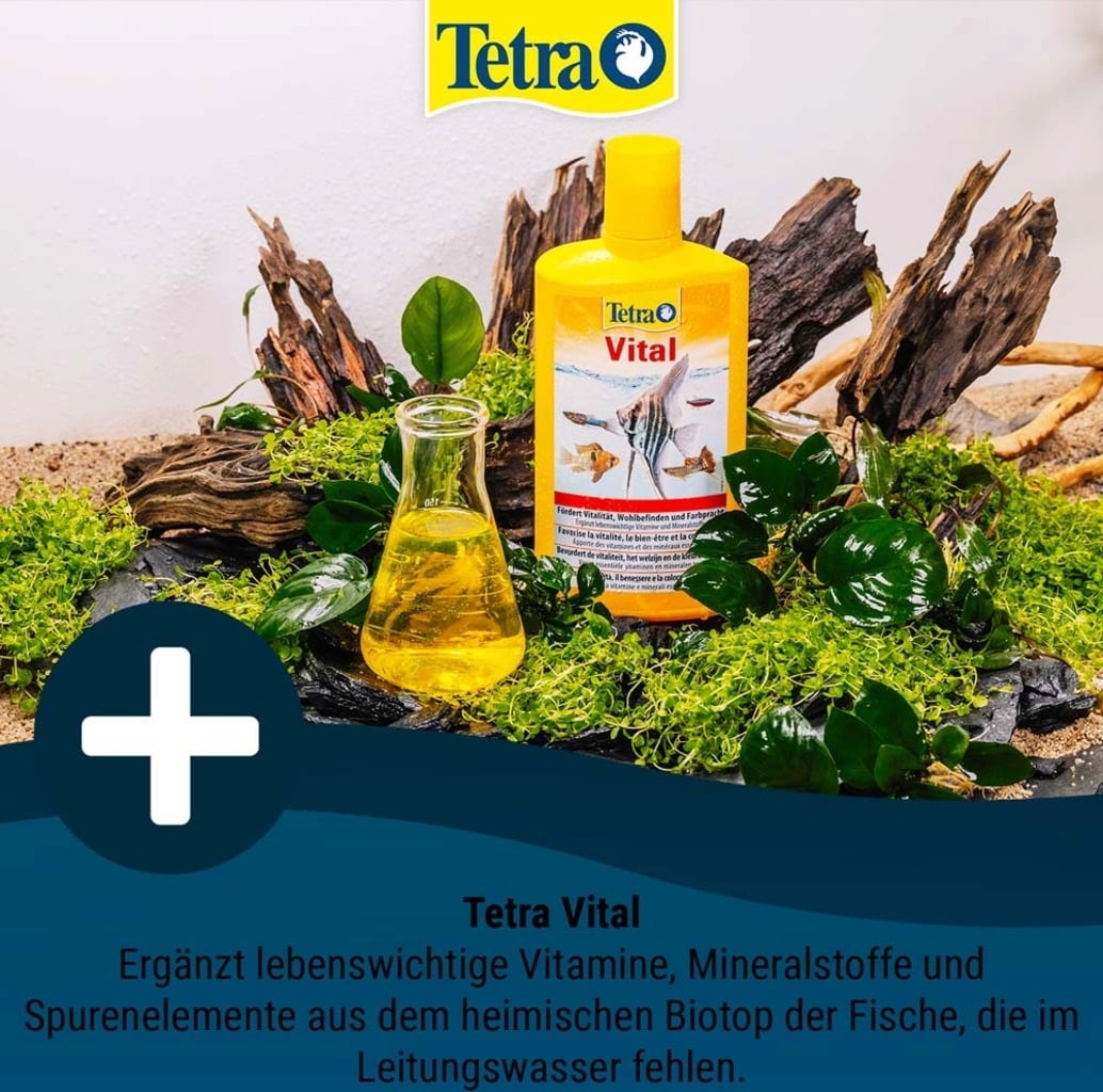 Tetra Vital dient der Förderung, des Wohlbefindens und der natürlichen Farbenpracht der Fische, Lebenswichtige Vitamine und Spurenelemente aus deren heimischem Biotop werden ergänzt, die im Leitungswasser fehlen oder im Aquarium verbraucht wurden. Dadurch entsteht ein naturnaher Lebensraum in dem sich Fische wohlfühlen und ihre natürliche Farbenpracht entfalten. Naturaktive B-Vitamine sorgen für mehr Vitalität und reduzieren Stress. Magnesium steigert das Wohlbefinden und fördert ein gesundes Wachstum. Panthenol pflegt die Schleimhäute der Fische und Jod erhöht sowohl ide Paarungsbereitschaft, als auch den Laicherfolg. Wichtige Spurenelemente beugen Mangelerscheinungen vor. Das Wachstum von Pflanzen und Mikroorganismen wird gefördert.