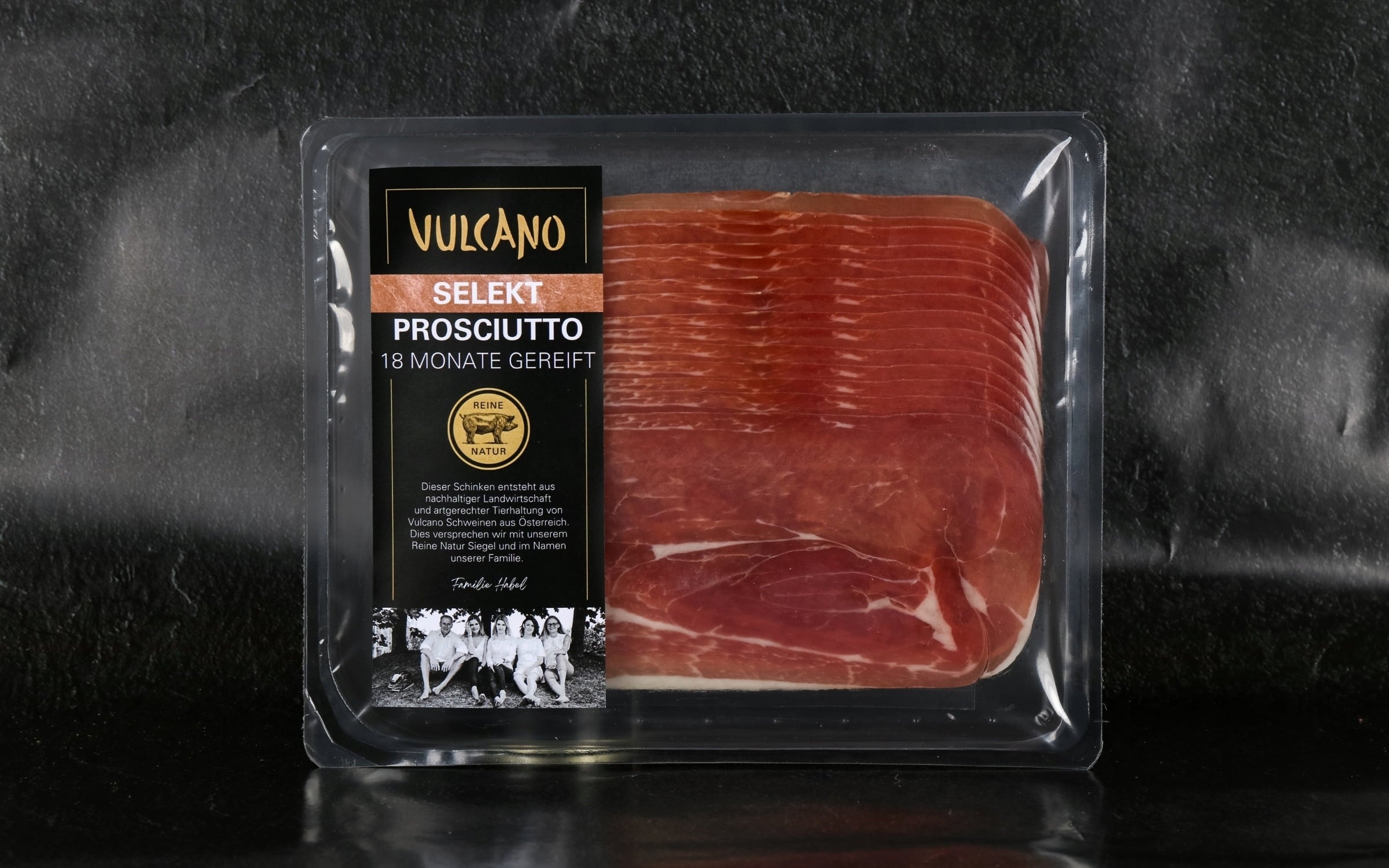Bestes Fleisch, meisterhaftes Handwerk und viel Zeit: Dank dieser Eckpfeiler in der Herstellung feiner Rohschinken erreicht Vulcano unvergleichliche Aromen, die selbst anspruchsvollste Feinkostianer ins Schwärmen bringen. Der Prosciutto durfte 18 Monate reifen und wurde ausschließlich mit natürlichen Zutaten veredelt. Die Spezialität kommt bereits fein aufgeschnitten ins Haus, servierbereit für Familie und Gäste. Herzhaft und erlesen, direkt aus dem steirischen Vulkanland, einem Hotspot österreichischer Schmankerl-Kulinarik!